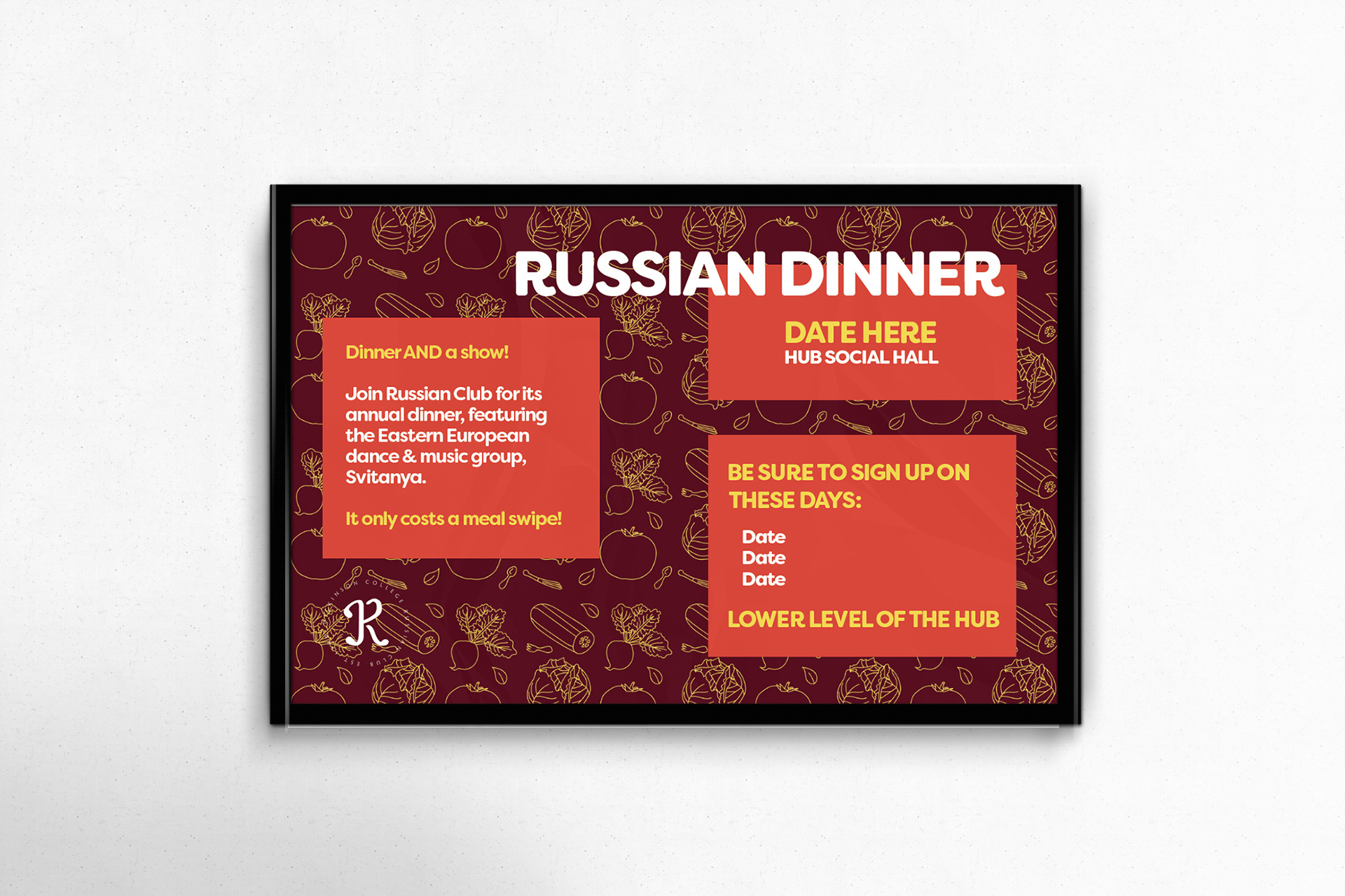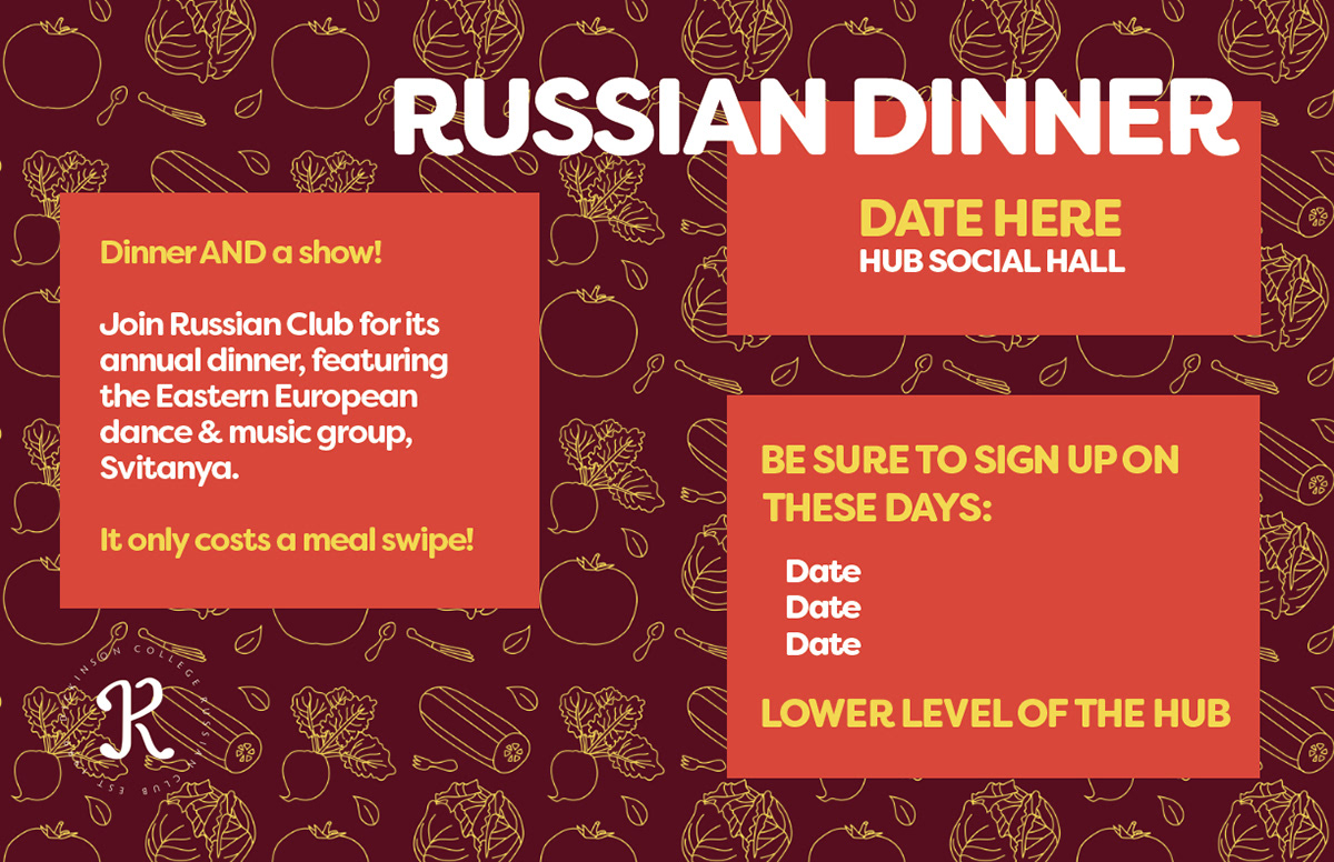 Poster design for Dickinson College Russian Club's spring event, Russian Dinner. The signup and event dates aren't included since the poster will be used for future events.